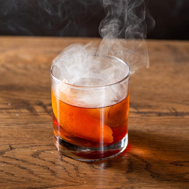 Whiskey Acres Bourbon, Demerara Simple, Peychaud's & Orange Bitters, Smoke
